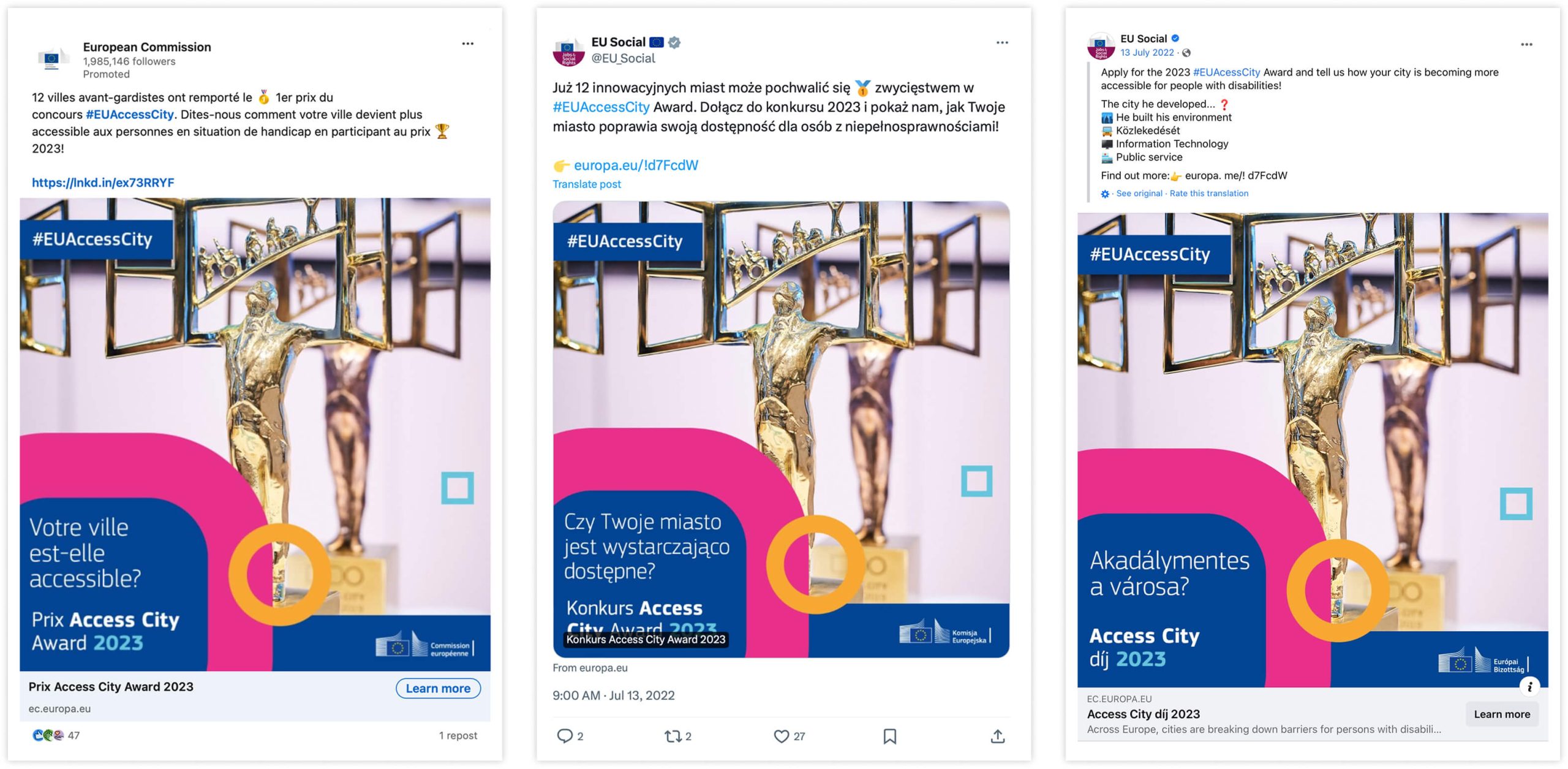 We created a large range of multi-language visual assets adapted for different channels, including static images and banners for Facebook, Instagram, LinkedIn and X.